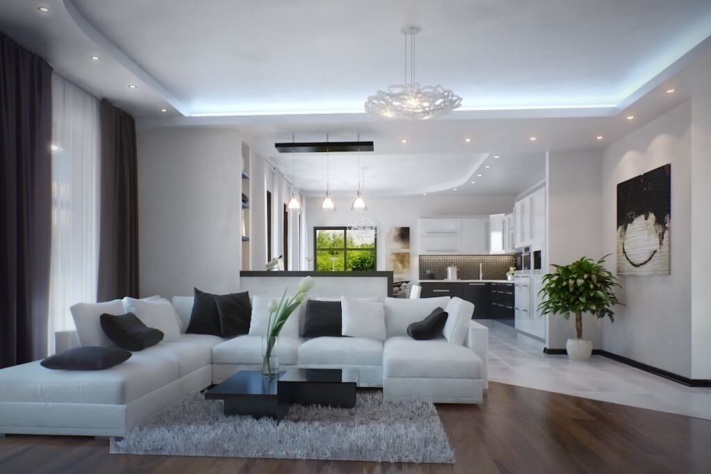 | Зонирование | Визуальное (цвет, свет, мебель), мобильные перегородки, барная стойка, подиум | Физическое (арки, колонны, перегородки), остров, многоуровневый потолок |