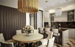 В столовой также имеется буфет со стеклянными дверцами, полки которого подсвечены. На них традиционно располагаются посуда и фужеры.