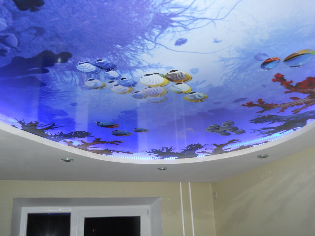 На ПВХ можно наносить любые изображения с помощью фотопечати, что стало актуальным трендом. Особенно востребованы 3D-изображения. Если правильно выбрать рисунок, ваш двухуровневый натяжной потолок на кухне станет настоящей изюминкой!